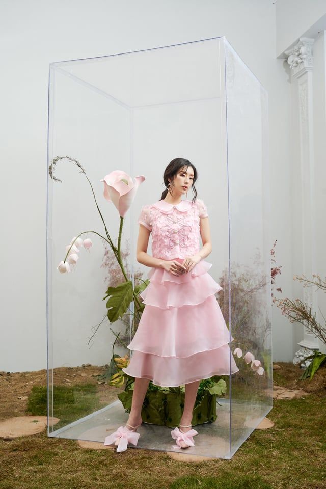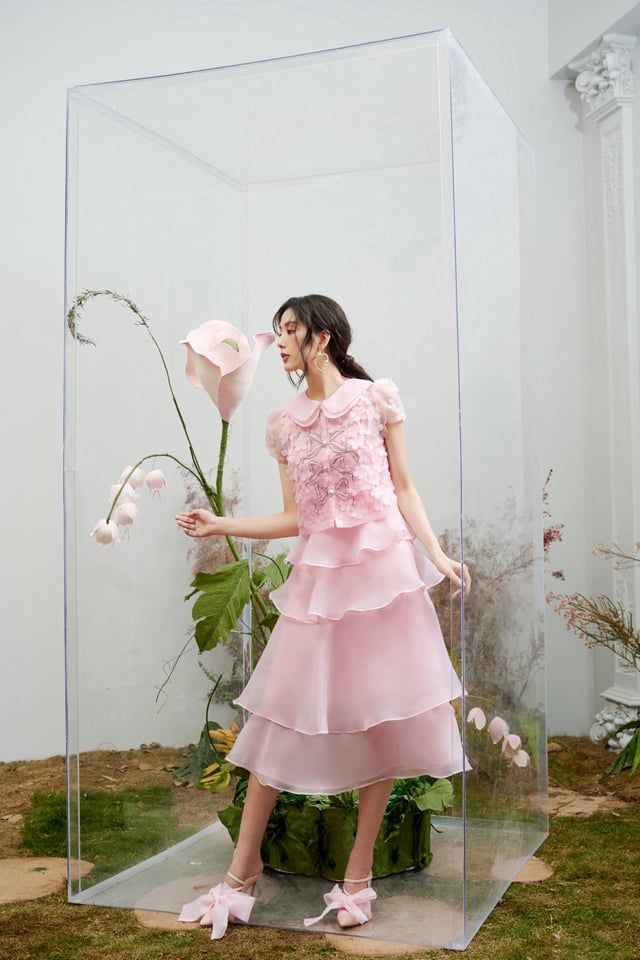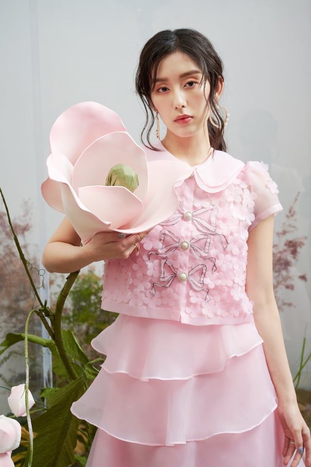 Áo sơ mi hồng organza 3 nơ đính hoaChân váy hồng organza 4 tầng