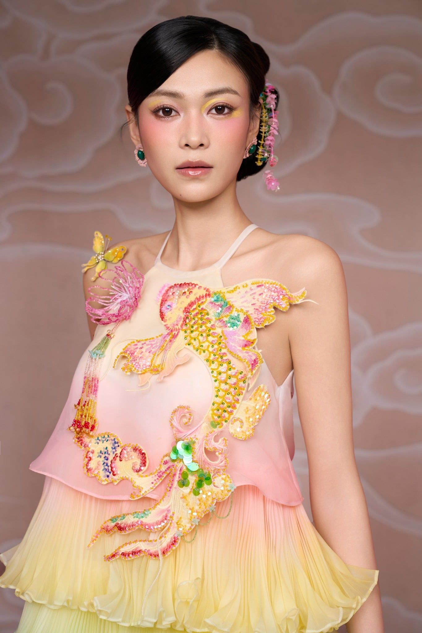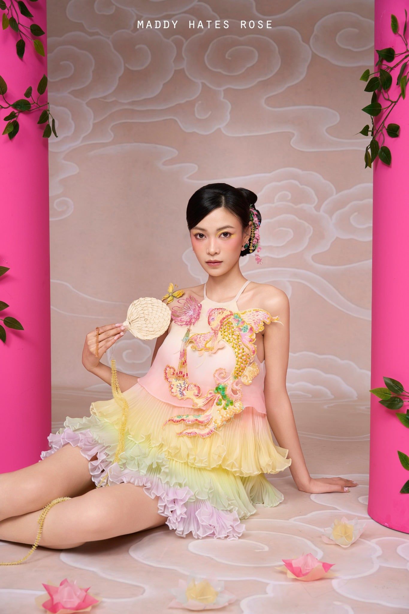 Đầm babydoll thêu đính cá thủ công ombre tầng dập ly chất liệu organza giá 3850k, quần giá 1250k