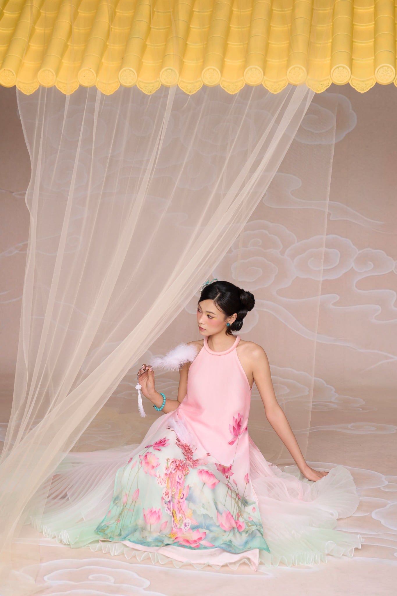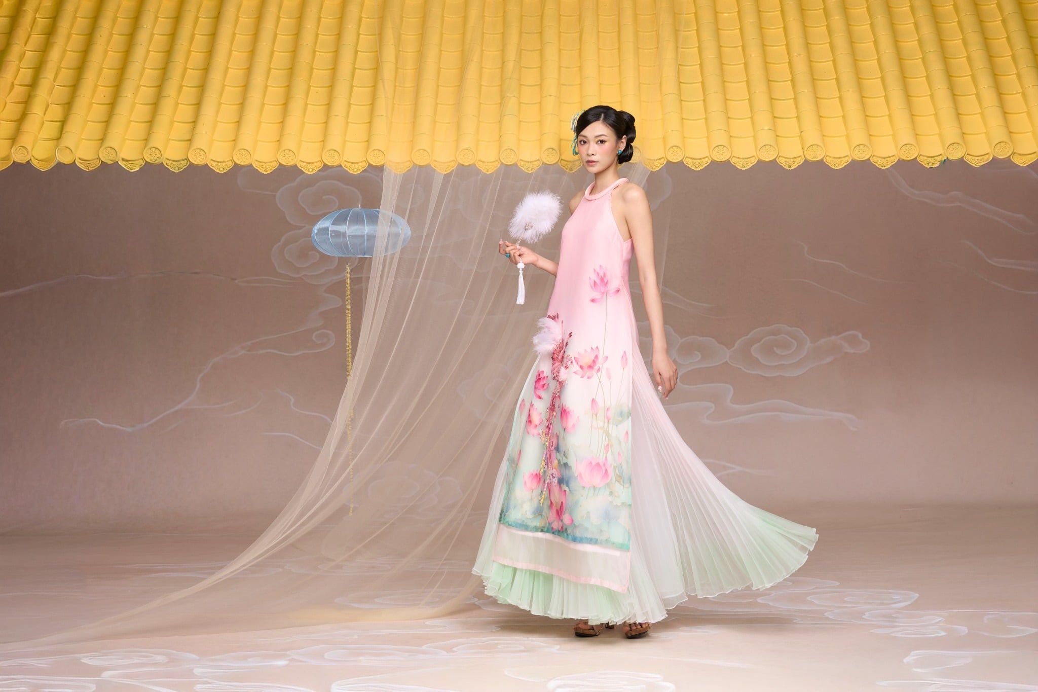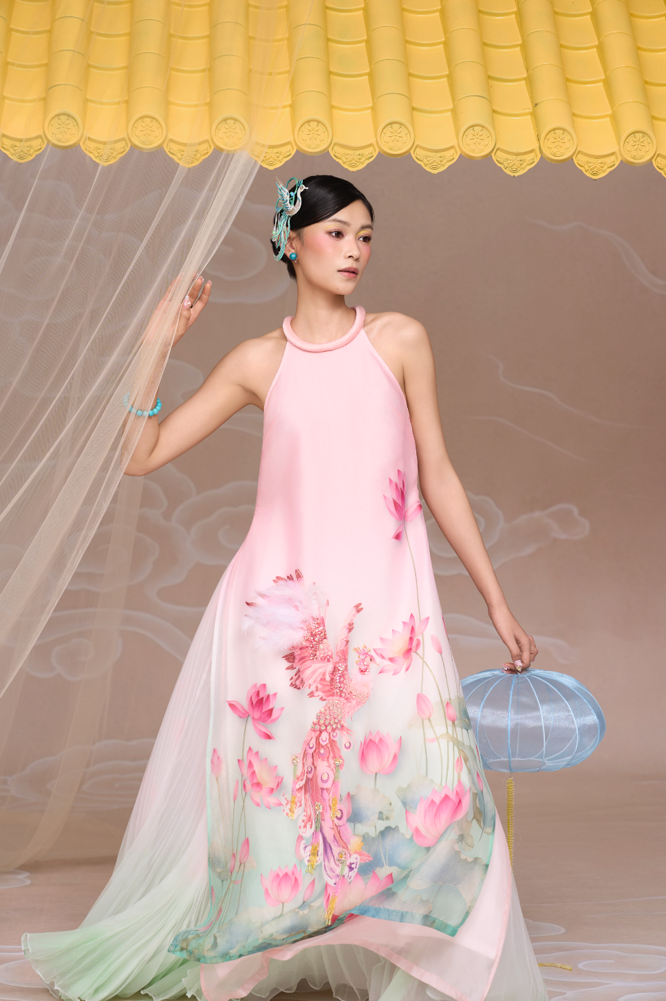 Áo dài yếm sen chim phượng đính thủ công giá 2850k, chân váy dập ly ombre 1550k