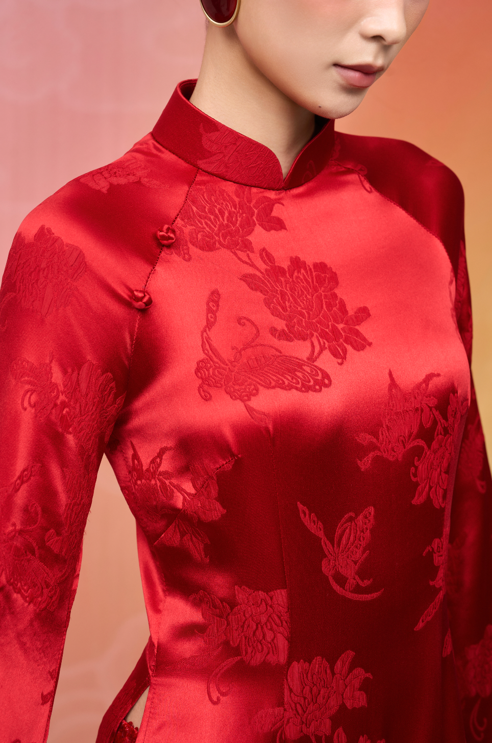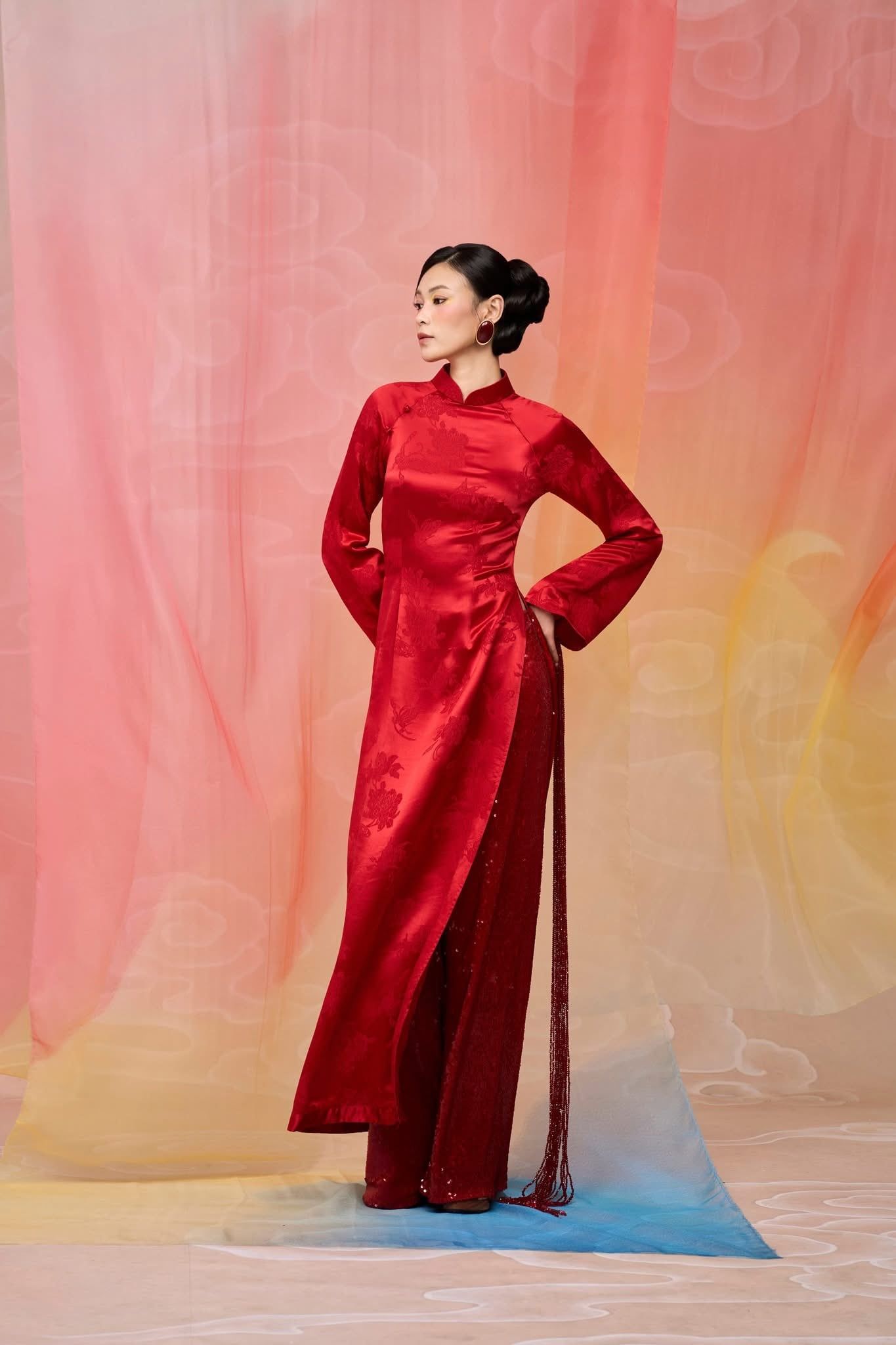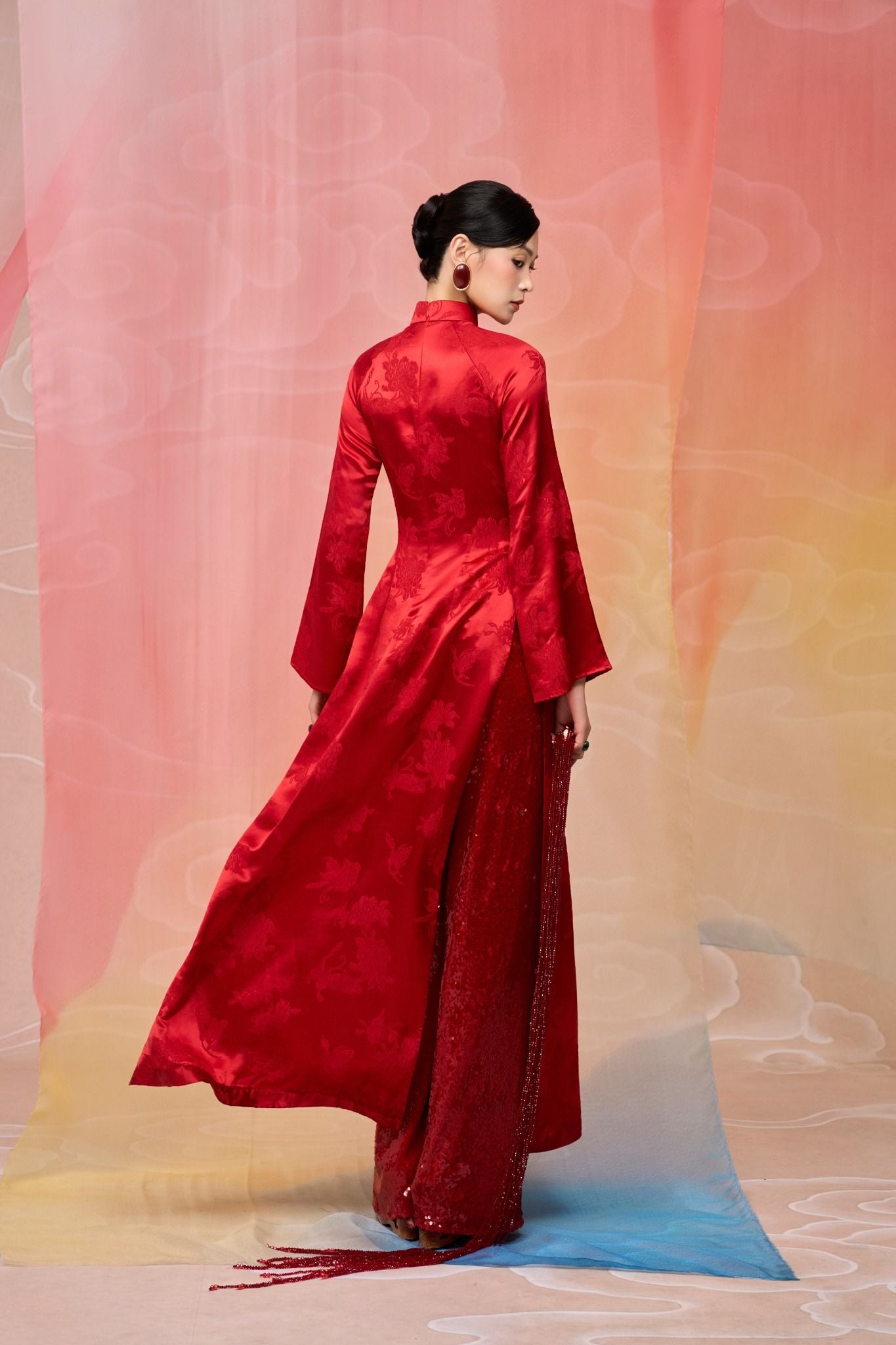 Áo dài đỏ tơ tằm giá 2450k, quần sequin đỏ giá 1250k