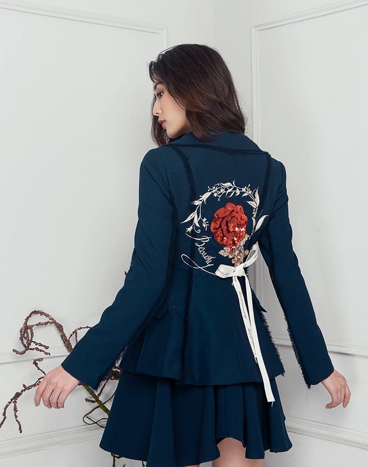Set vest xanh lam thêu hoa hồng sequin.