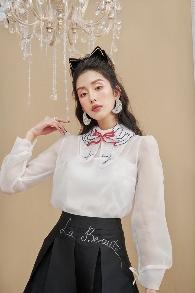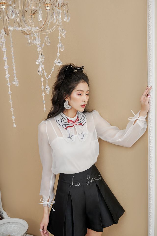 Áo sơ mi organza trắng thêu tay 929k và quần sooc tafta đen thêu 739k