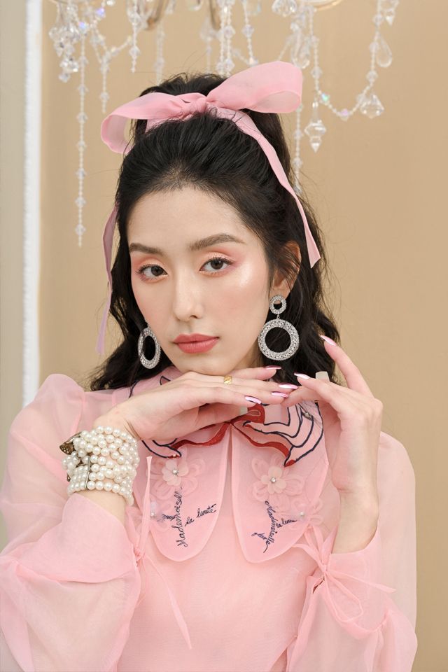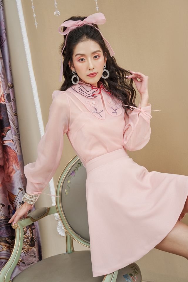 Áo sơ mi organza hồng thêu tay 929k và chân váy hồng 455k