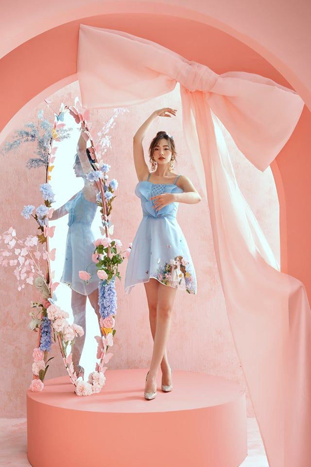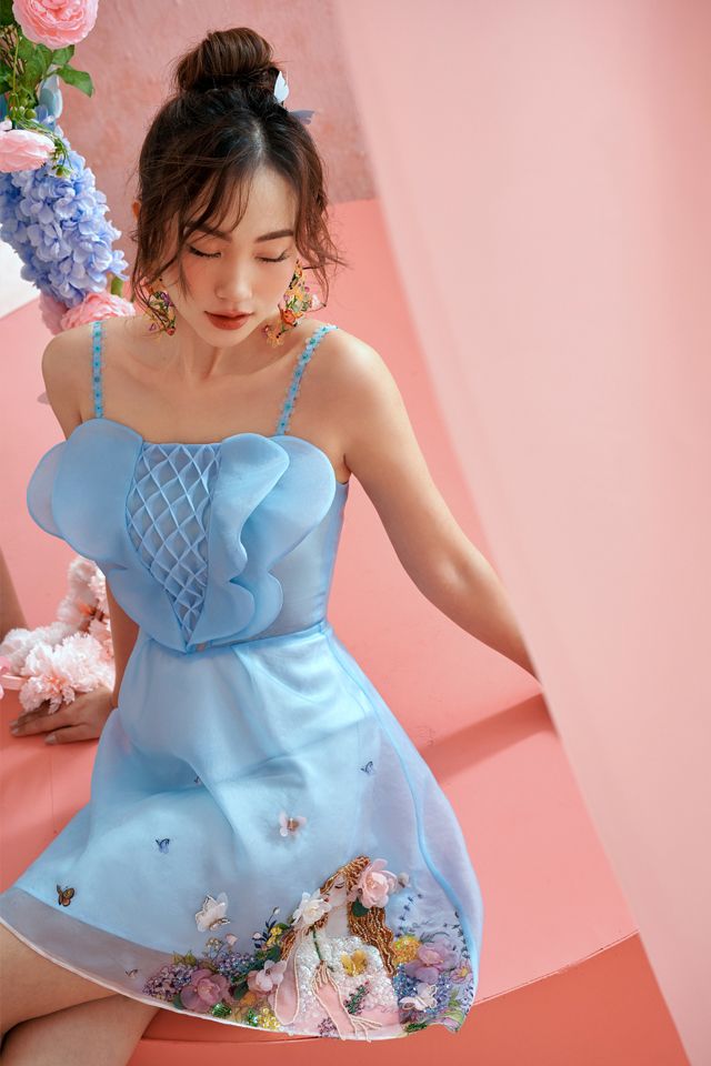 Đầm xanh 2 dây thêu cô gái