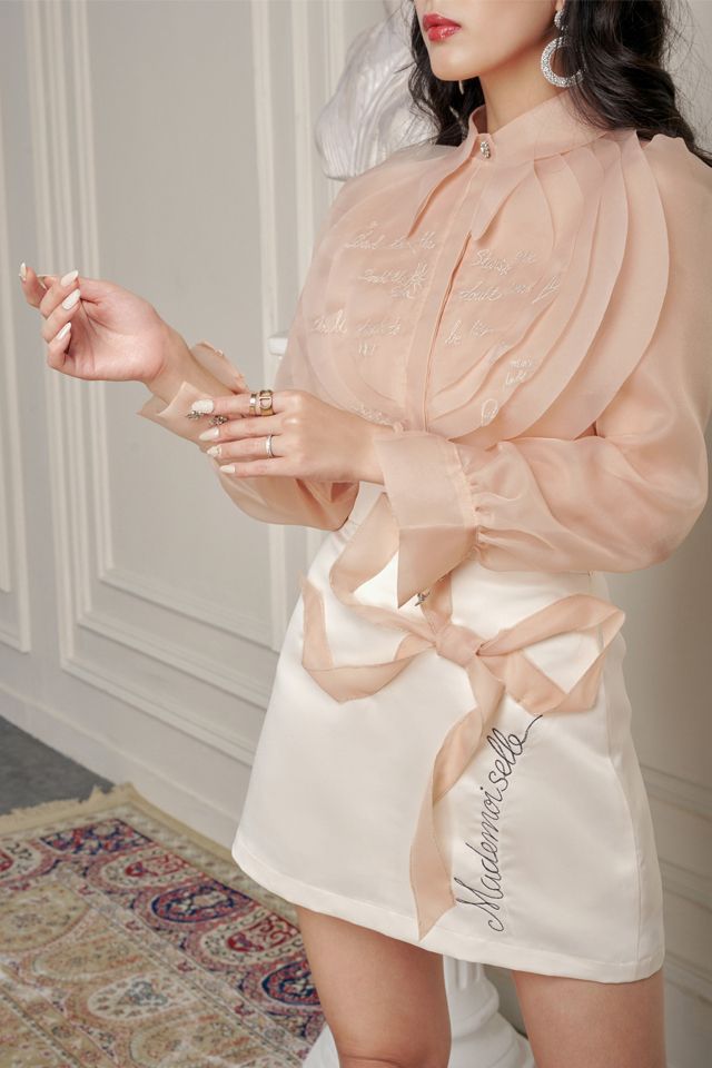 Áo sơ mi be organza thêu tơ và chân váy tafeta trắng.