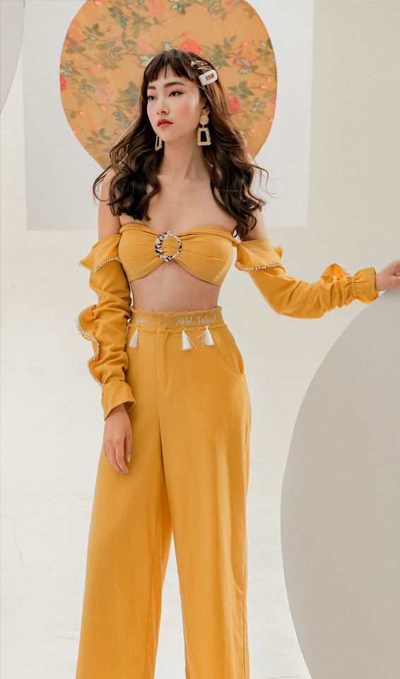 Áo croptop vàng chất liệu linen và quần linen suông viền tua rua.